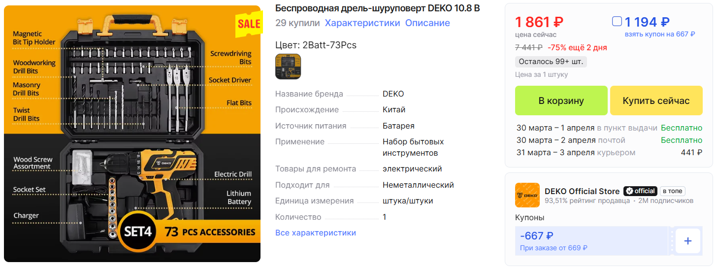 Набор DEKO в удобном кейсе с купоном от продавца всего за 1194р. Крутящий момент 32 Нм, двухскоростной редуктор (0–400 и 0–1500 об/мин), 18+1 положений регулировки усилия. Есть подсветка рабочей зоны и индикация заряда аккумулятора.