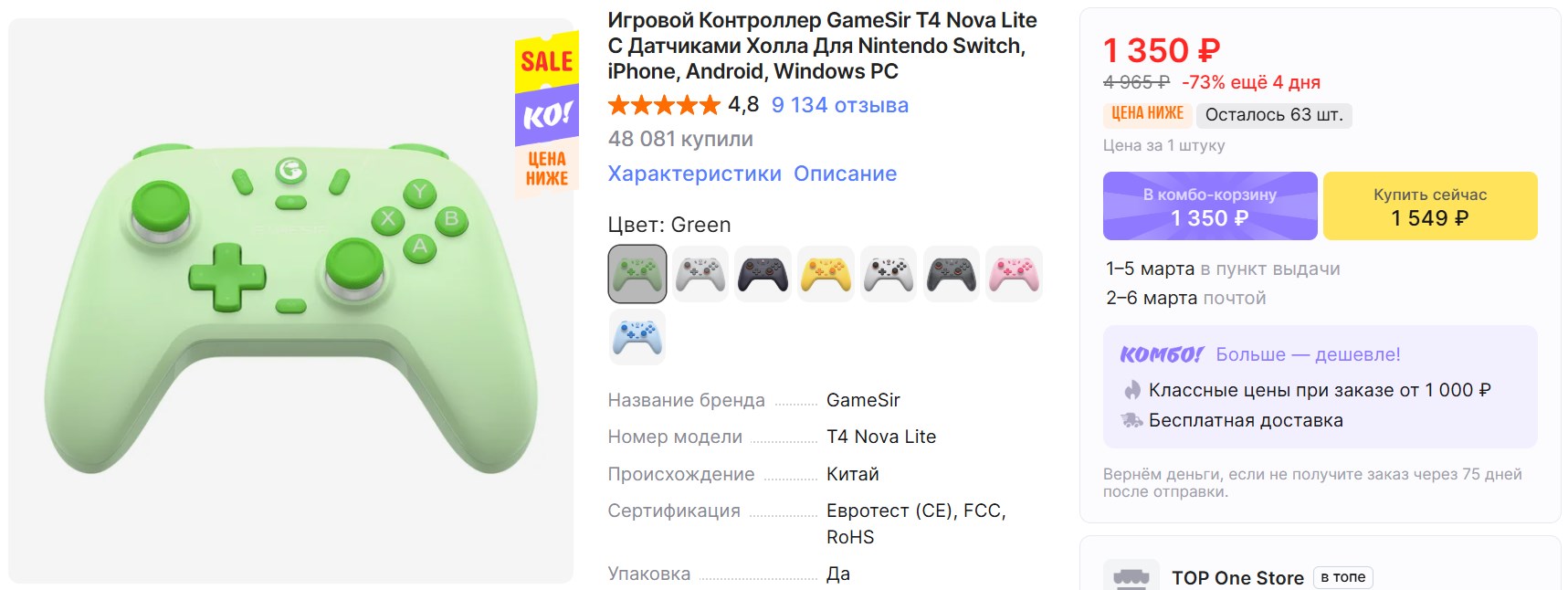 Это, пожалуй, лучшее предложение среди недорогих геймпадов. Главная фишка здесь - Hall Effect стики на магнитах, которые в принципе не подвержены дрифту со временем. Работает везде: Switch, iPhone, Android, ПК, Steam. Три варианта подключения - Bluetooth, беспроводной донгл или USB-C, плюс два вибромотора, турбо-кнопка и удобный софт-тач для настройки.