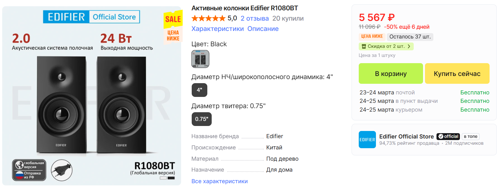 Настольная стереосистема с Bluetooth 5.1. Две полочные колонки, в каждой по два динамика. Суммарная мощность 24 Вт, частотный диапазон 67 Гц - 20 кГц. В комплекте аудиокабель для проводного подключения.