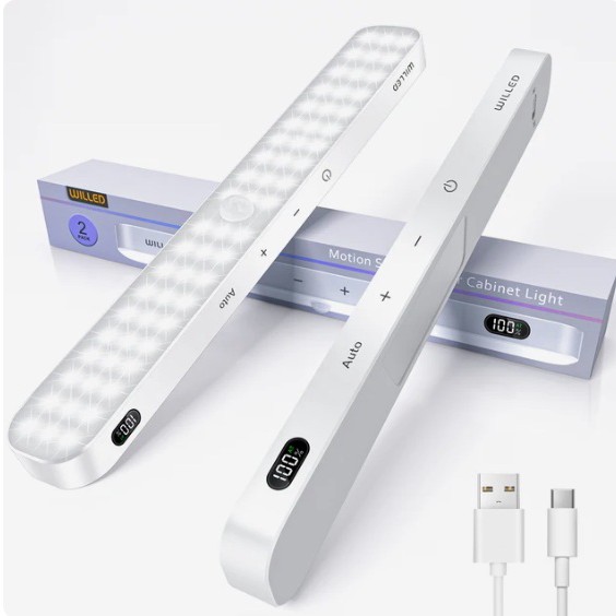 Длина 24 см, светит холодным белым (6000 К), мощность 1,5 Вт, поток 150 люмен. Внутри аккумулятор на 1300 мАч. Два режима: либо автоматически включается при движении в темноте (датчик с обзором 120° и радиусом до 3 метров), либо просто горит постоянно. Управление сенсорное, на корпусе индикатор заряда, так что видно, когда пора подзарядить.
