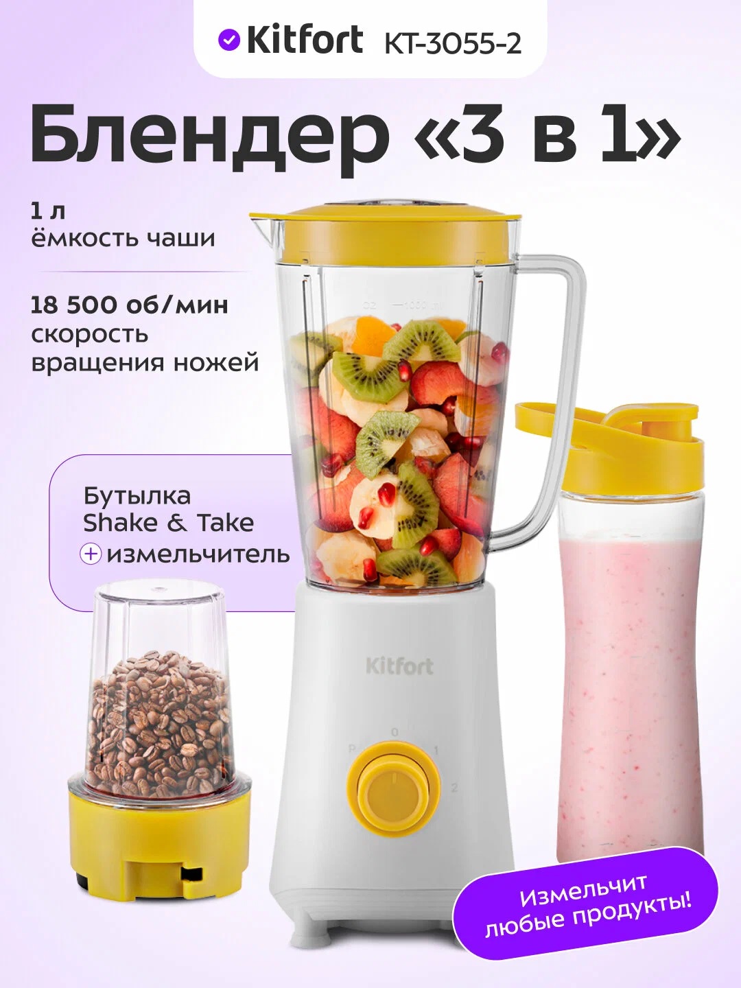 Присмотрела компактный и функциональный блендер для помощи на кухне. Работает в 3 режимах стационарный блендер (чаша 1 л), портативный блендер с бутылкой Shake & Take для смузи в дорогу и кофемолка. Ножи из нержавеющей стали со скоростью вращения до 18500 об/мин. Мощность 300 Вт, 2 скорости работы. Подойдёт для приготовления смузи, коктейлей, пюре, помолки кофе, перца.