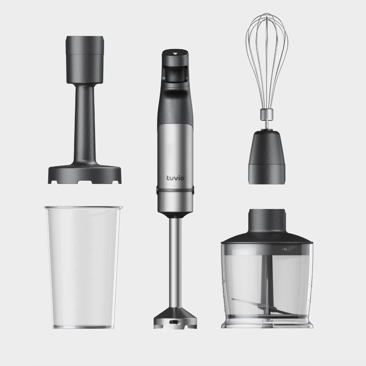 В коробке: сам блендер, венчик насадка для пюре, измельчитель 0.5 л и мерный стакан.
