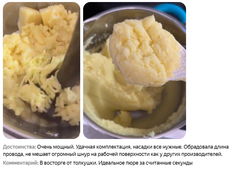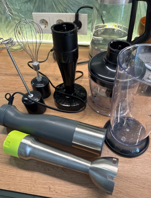 В комплекте: сам блендер, измельчитель на 0,5 л для орехов и лука, миксер для теста, вспениватель молока для капучино и насадка для пюре без комков - это отдельный плюс.