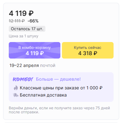 При покупке через комбо-корзину сейчас цена 4119 р, а на ozon и яндекс маркет такая от 5346 р (тоже с доставкой из-за рубежа).