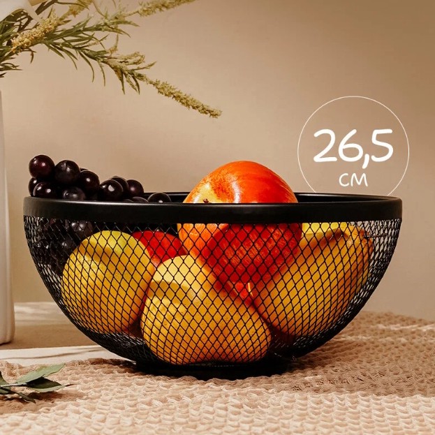 На Яндекс Маркете сейчас 405₽ за фруктовницу Доляна с промокодом на 10% скидку. Диаметр 26,5 см, высота 12,8 см. Материал - металл, цвет чёрный.