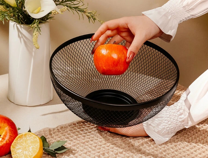 Подойдёт не только для фруктов - можно хранить овощи, кофейные капсулы или другие мелочи. Геометрический рисунок выглядит аккуратно и стильно.