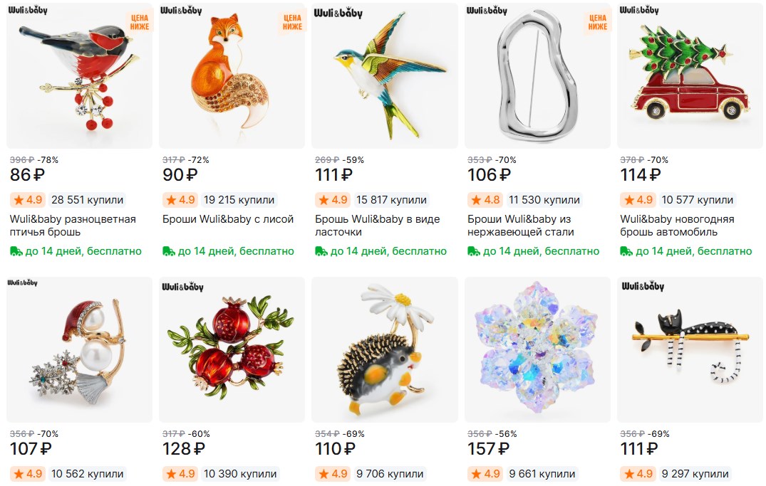 Ребята, нашёл на AliExpress симпатичные броши от Wuli&baby. Цены смешные, доставка бесплатная, а выглядят они довольно мило. Можно взять себе под настроение или в подарок - за такие деньги хоть коллекцию собирать.