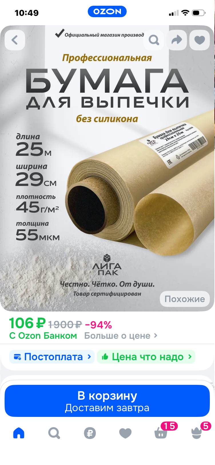 Бумага для выпечки без силикона (пергамент) 25 м