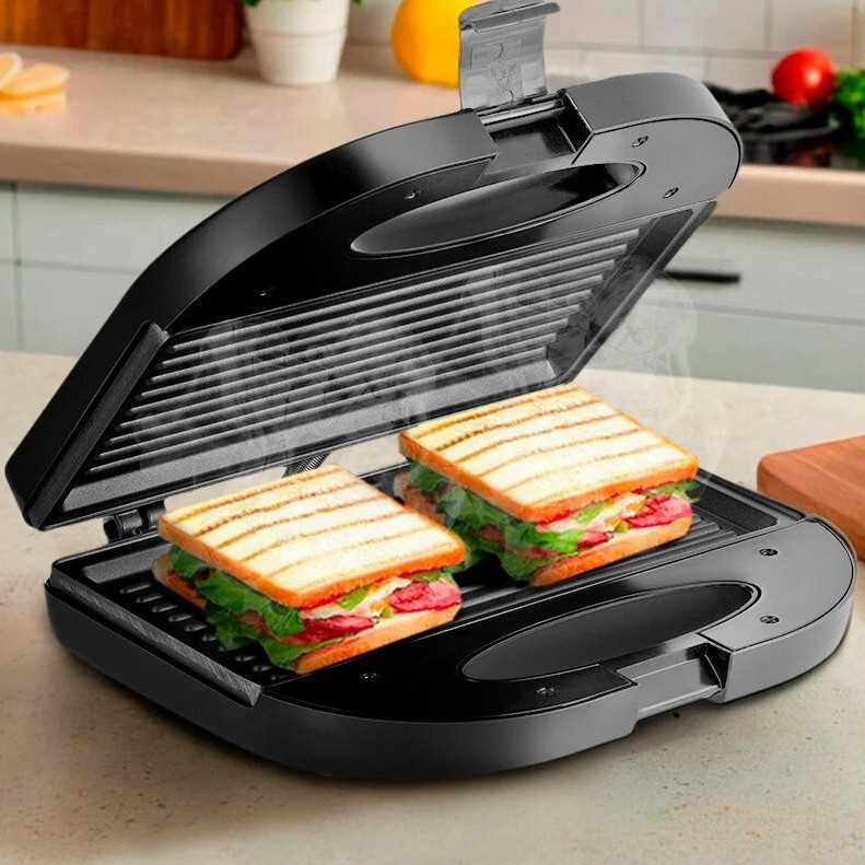 Небольшая простая бутербродница/гриль. Мощность 750 Вт, антипригарное покрытие панелей. Из минусов - несъемные панели и нет отдельной кнопки выключения, но так у многих. Люблю панини, под них точно годится по такой цене