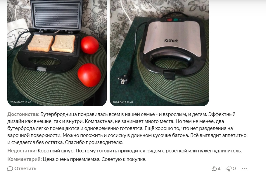 Отзывов кстати много. На скрине ниже размер можно оценить, два тостерных кусочка влезает спокойно.