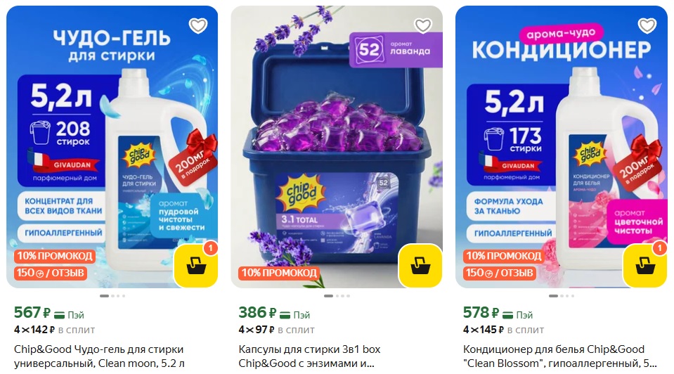 Бытовая химия Chip&Good по доступным ценам + начислят 150 баллов Плюса за отзыв. В каталоге представлены средства для стирки, кондиционеры, пятновыводители.