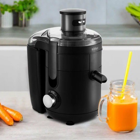 Это центробежная модель мощностью 350 Вт, которая отжимает сок при 15000 оборотов в минуту. У неё два режима: для мягких фруктов и для твёрдых овощей. Чаша для сока и ёмкость для жмыха - обе по 0.9 литра. Есть удобная мелочь: противокапельная система, чтобы сок не капал на стол, когда вынимаешь чашу.