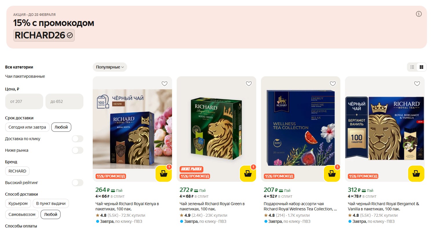 На Яндекс Маркете сейчас скидка 15% на чай Richard. Промокод работает на весь ассортимент из каталога.