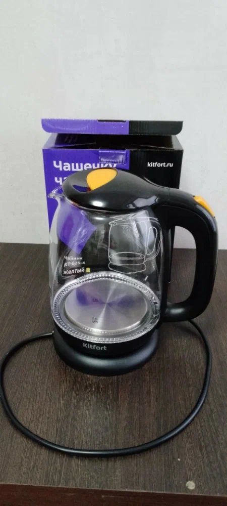Яркий жёлтый чайник с голубой подсветкой. Быстро вскипятит воду, объём 1,7 л и мощность 2200 Вт справятся с задачей за минуты. Дисковый нагреватель легко чистить.