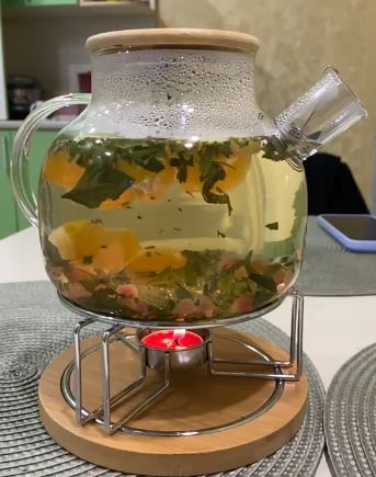 Указано, что чайник из боросиликатного стекла и его можно подогревать на электрической плите или на подставке со свечкой, но не пробовала, хотя в отзывах есть фото. Подставку надо покупать отдельно.
