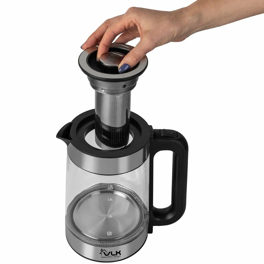 Стеклянный чайник с подсветкой и металлическими вставками . Мощность 2200 Вт, греет быстро. Внутри съёмное ситечко из нержавейки. Фильтр от накипи есть, шнур убирается в отсек на подставке. Для дома норм.