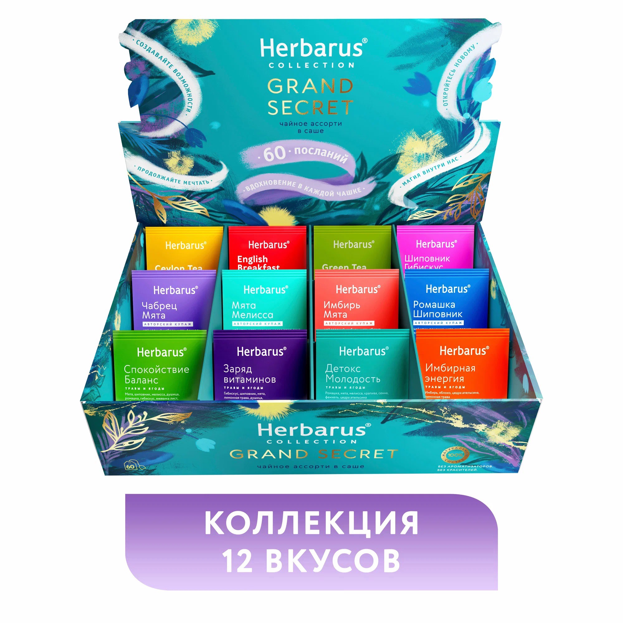 В наборе собраны насыщенные классические чёрные сорта, лёгкие и тонизирующие зелёные, а также уютные травяные чаи, всего 12 различных вкусов.
