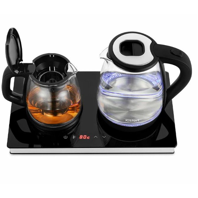 Это чайник на 2 л и заварник 1.2 литра со съёмным фильтром с общей базой с сенсорами и дисплеем. Можно отдельно греть воду и отдельно заваривать.