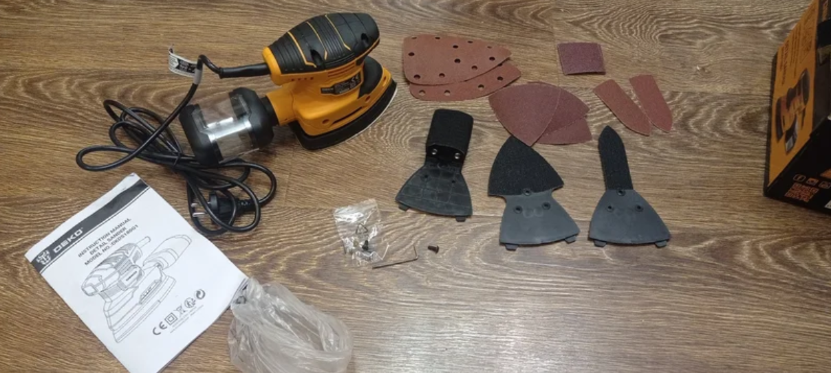 Замена наждачной бумаги упрощена за счёт системы крепления Hook‑and‑Loop. В комплект входят 12 листов разной зернистости и 3 сменные насадки для шлифовки в труднодоступных местах и узких углах.