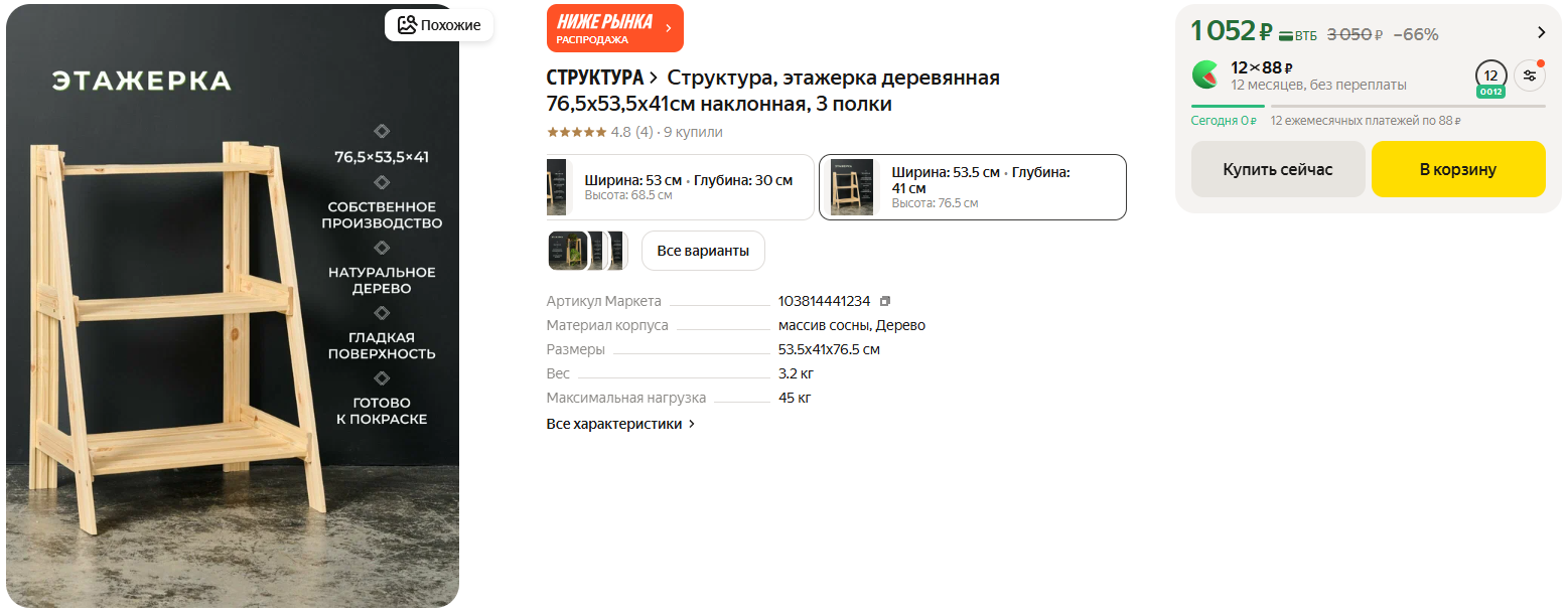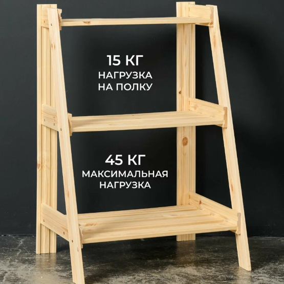 Компактная, лёгкая, удобная, размеры: 76,5×53,5×41 см, сделана из массива сосны, три открытые полки, расстояние между ними 29,5 см. Нагрузка до 15 кг на полку, общая до 45 кг.