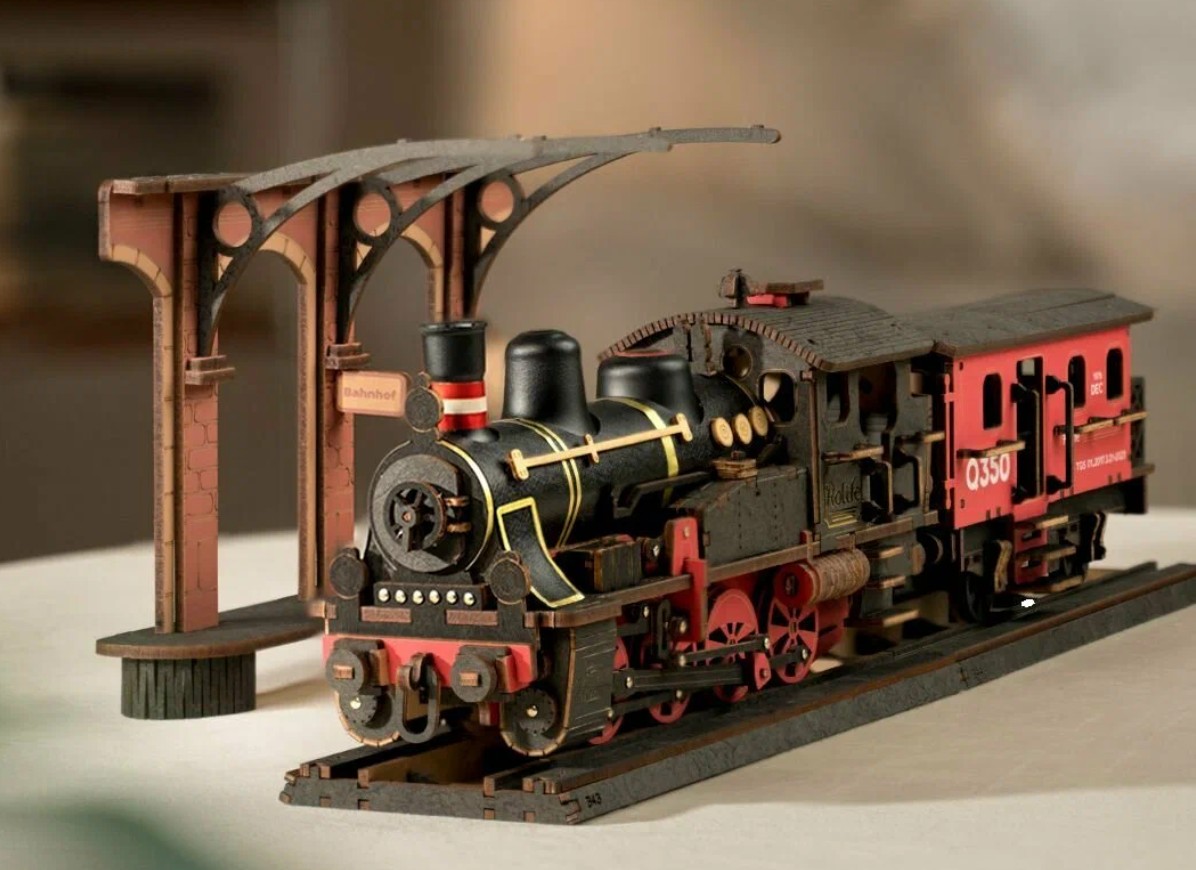 Собирается в паровоз, вагон, рельсы и платформу. Модель получается красивая, чёрно-красная, с золотыми элементами. Длина готового поезда 37 см.