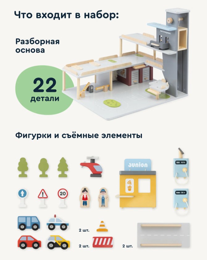 Внизу есть просторные боксы для машин и автомойка с вращающимися щётками, на втором уровне - магнитная заправка, а на самом верху - автокафе. Машинки поднимаются на специальном лифте, который можно останавливать, чтобы всё было под контролем. В наборе уже есть целая команда для игры: 22 фигурки, включая человечков, разные машинки, вертолёт и дорожные знаки. Всё сделано из дерева, покрашено безопасной краской.