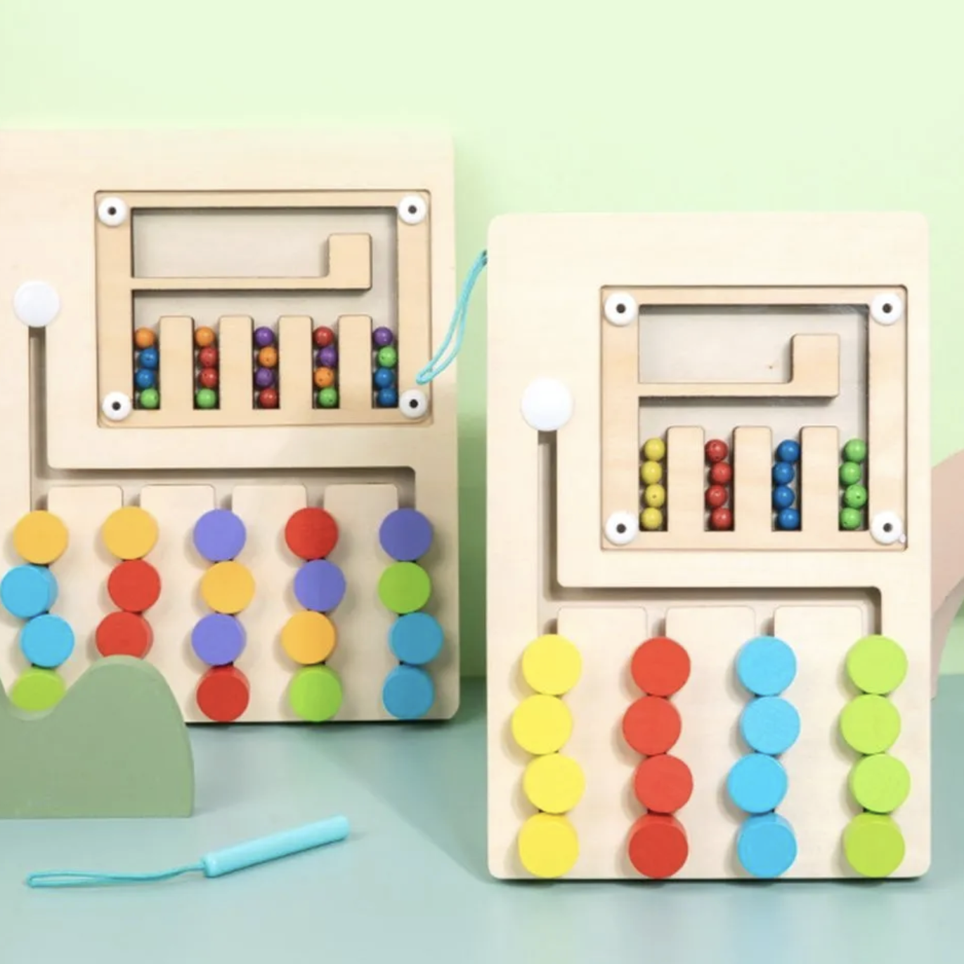 Простая, но хорошая, разноцветные детали, которые можно переставлять, складывать, подбирать по цветам. Всё из дерева, приятное на ощупь и яркое. Детишкам должно зайти