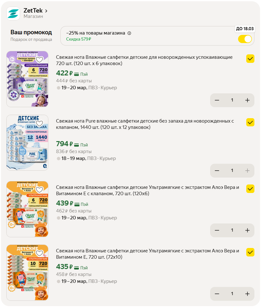 По подписке на магазин дополнительная скидка 25% на салфетки. Подходят для новорождённых: гипоаллергенные, без спирта и отдушек. Есть упаковки разного объёма - выбирай или запасайся впрок.