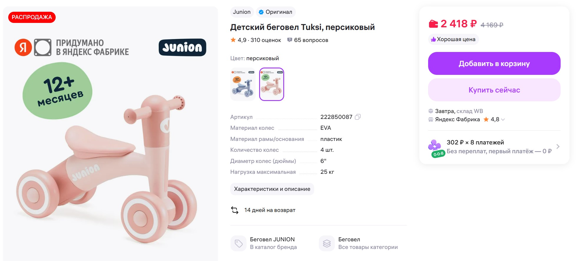 Давно мониторю своей дочке эту модель и наконец-то цену снизили, обычно больше 2к! На ВБ такой сейчас 2400. Он невероятно лёгкий, всего 3 кг, а мне его по лестнице таскать. Ещё у него литые колёса, которые не нужно подкачивать. Сиденье и руль регулируются, хватит не на одно лето, надеюсь ) Модель с одного года и до 25 кг
