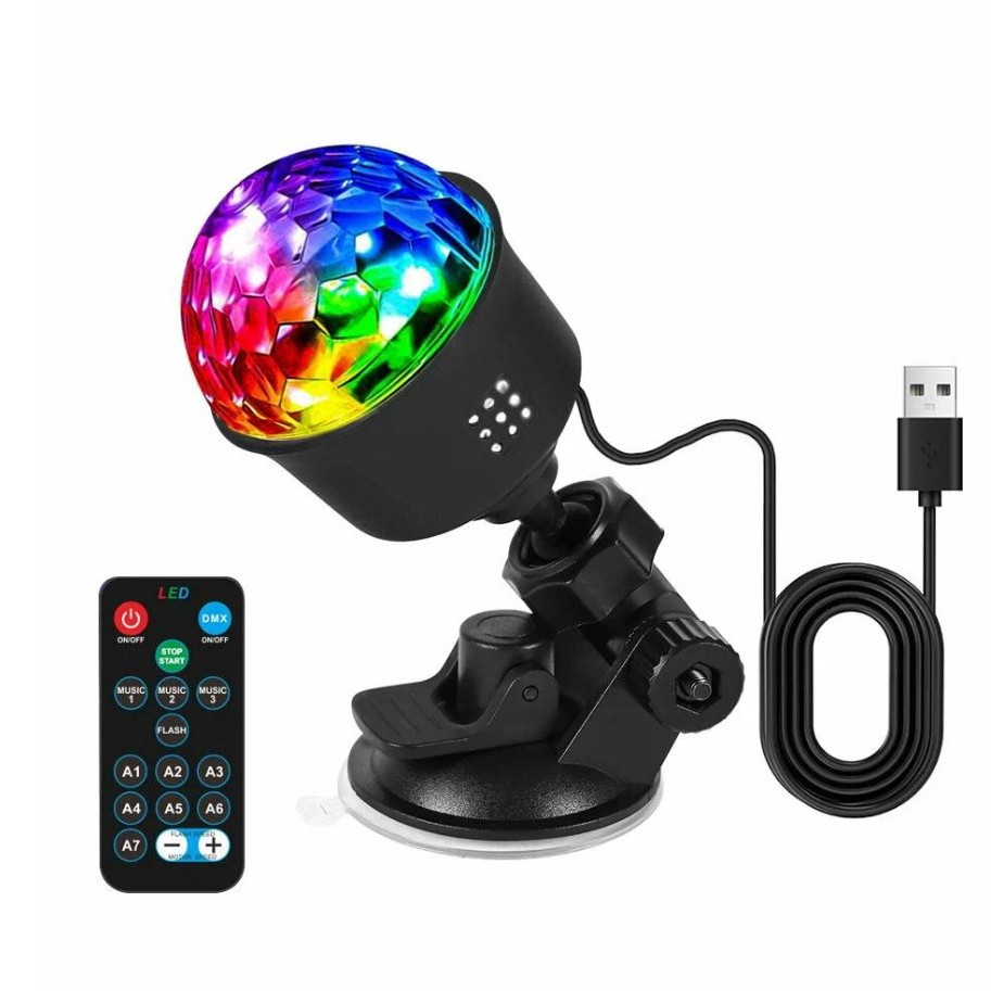 Недорогой световой гаджет для создания атмосферы. Он работает от пульта, умеет мигать под музыку и вращаться на 360, что добавляет динамики вечеринке или просто необычному освещению в комнате.