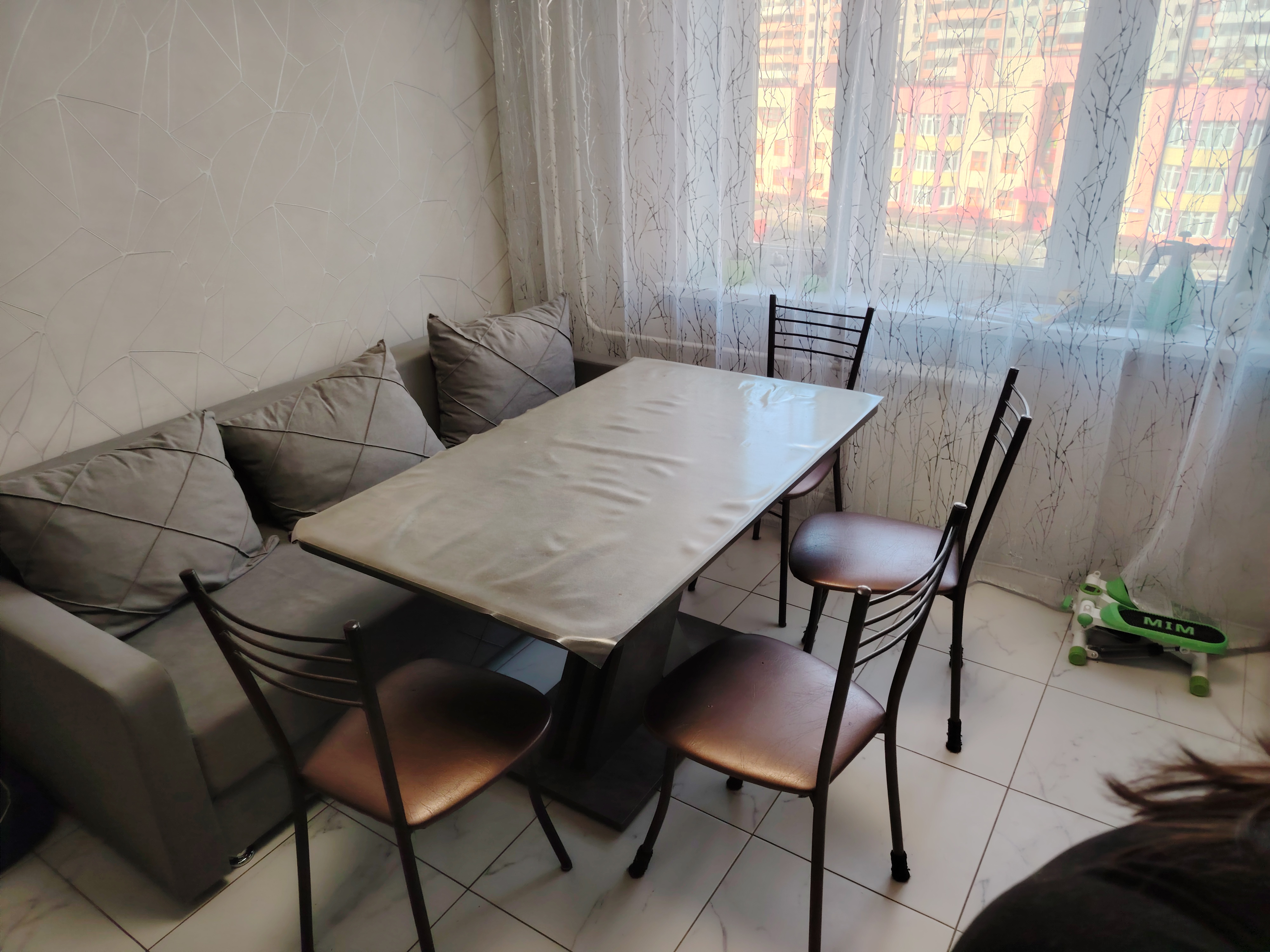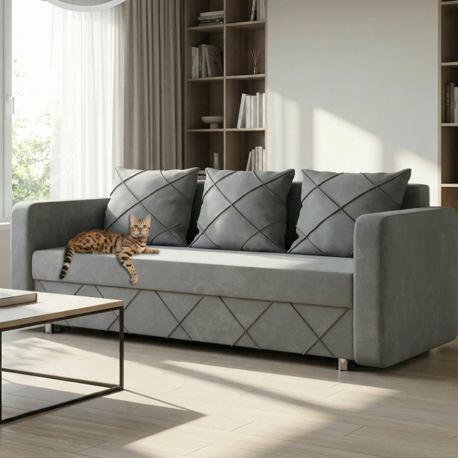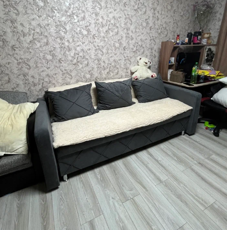 Дешевая цена, доставка 1400 рубл. Обычный раскладной диван с механизмом еврокнижка. Спальное место 190 на 140 см, беспружинный матрас из пенополиуретана. Есть ящик для белья, мягкие подлокотники, съёмные подушки. Обивка искусственный велюр, каркас из ДСП и фанеры.