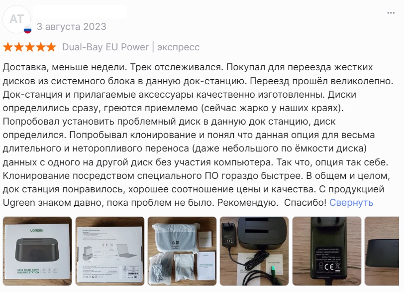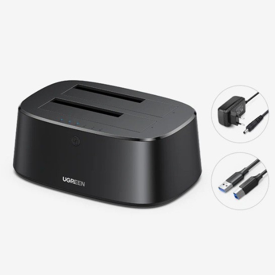 Хорошая цена на док-станцию UGREEN на Алиэкспресс с купоном от продавца. Подключается по USB 3.0, так что скорость норм - до 5 гигабит в секунду. Можно сразу два диска воткнуть, HDD или SSD SATA, и каждый до 20 терабайт поддерживает. Удобно, если надо быстро с одного на другой перекинуть или просто старые диски задействовать.