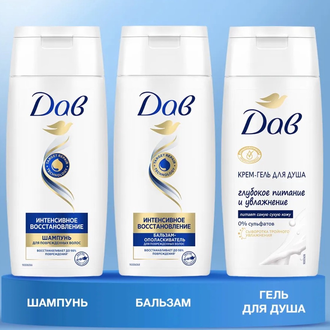 Шампунь и бальзам «Интенсивное восстановление». Гель для душа белые цветы, ваниль, древесина.