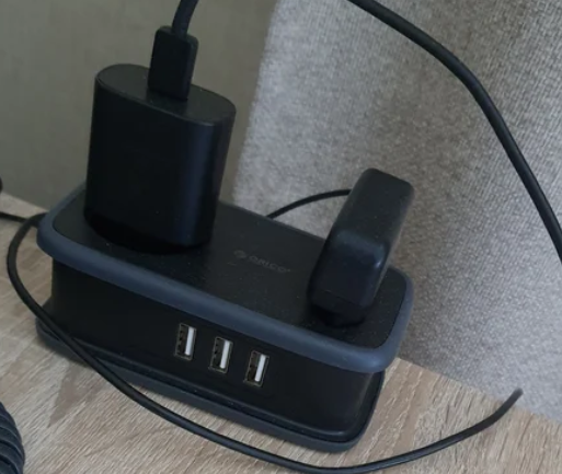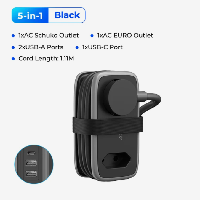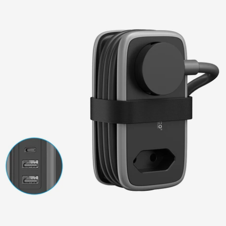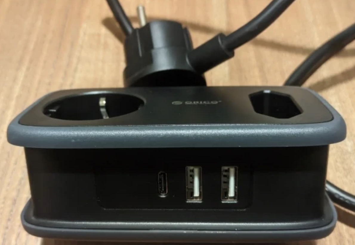 Внутри две розетки, два или три USB-A и USB-C в зависимости от модели. Плоская вилка не торчит, шнур 1,1 метр удобно сматывается резинкой. USB выдают до 15,5 Вт, сами подбирают ток под устройство. Снизу прорезиненные ножки - не скользит на столе.