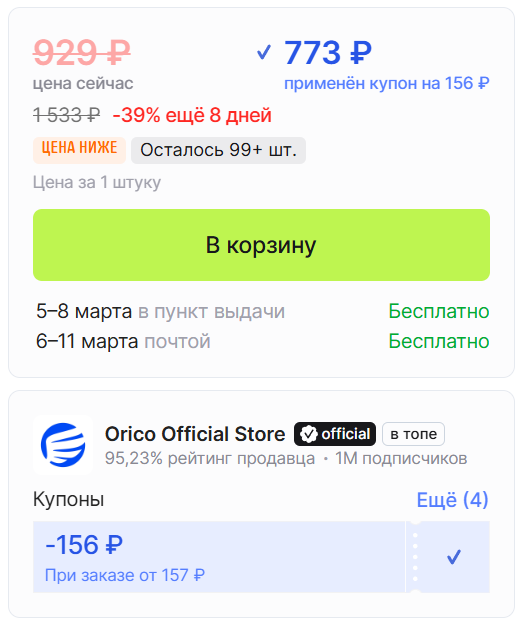 Хорошая вещь для поездок, компактный, лёгкий, помещается в любую сумку. С копуном продавца выходит за 773 рубля.