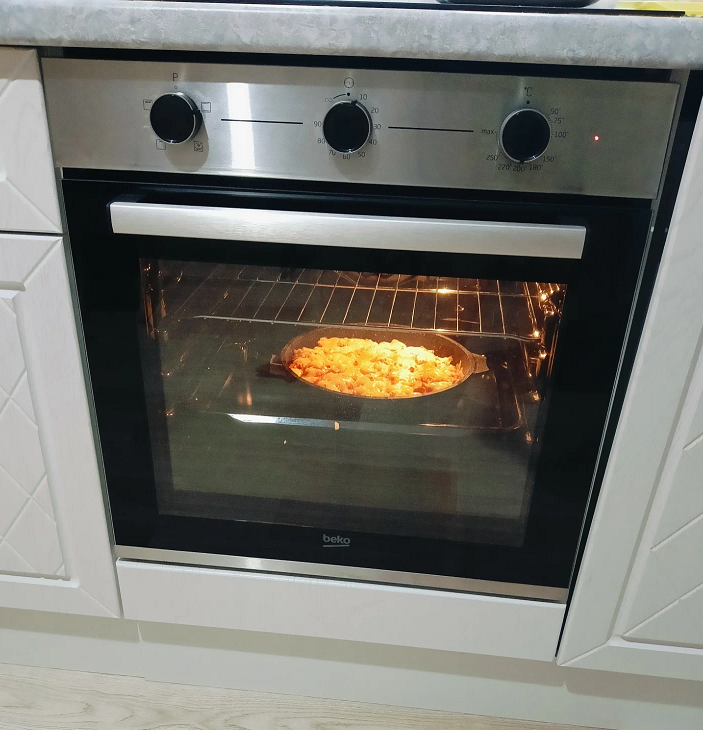 Обычная встраиваемая духовка без лишних наворотов, но с большим объёмом 74 литра. Влезет и индейка, и большой противень с выпечкой. Режимов четыре, есть гриль для запекания корочки. Управление механическое, ручки крутятся, есть таймер, всё просто и надёжно. Стекол на дверце два, греется умеренно. Класс энергоэффективности А.