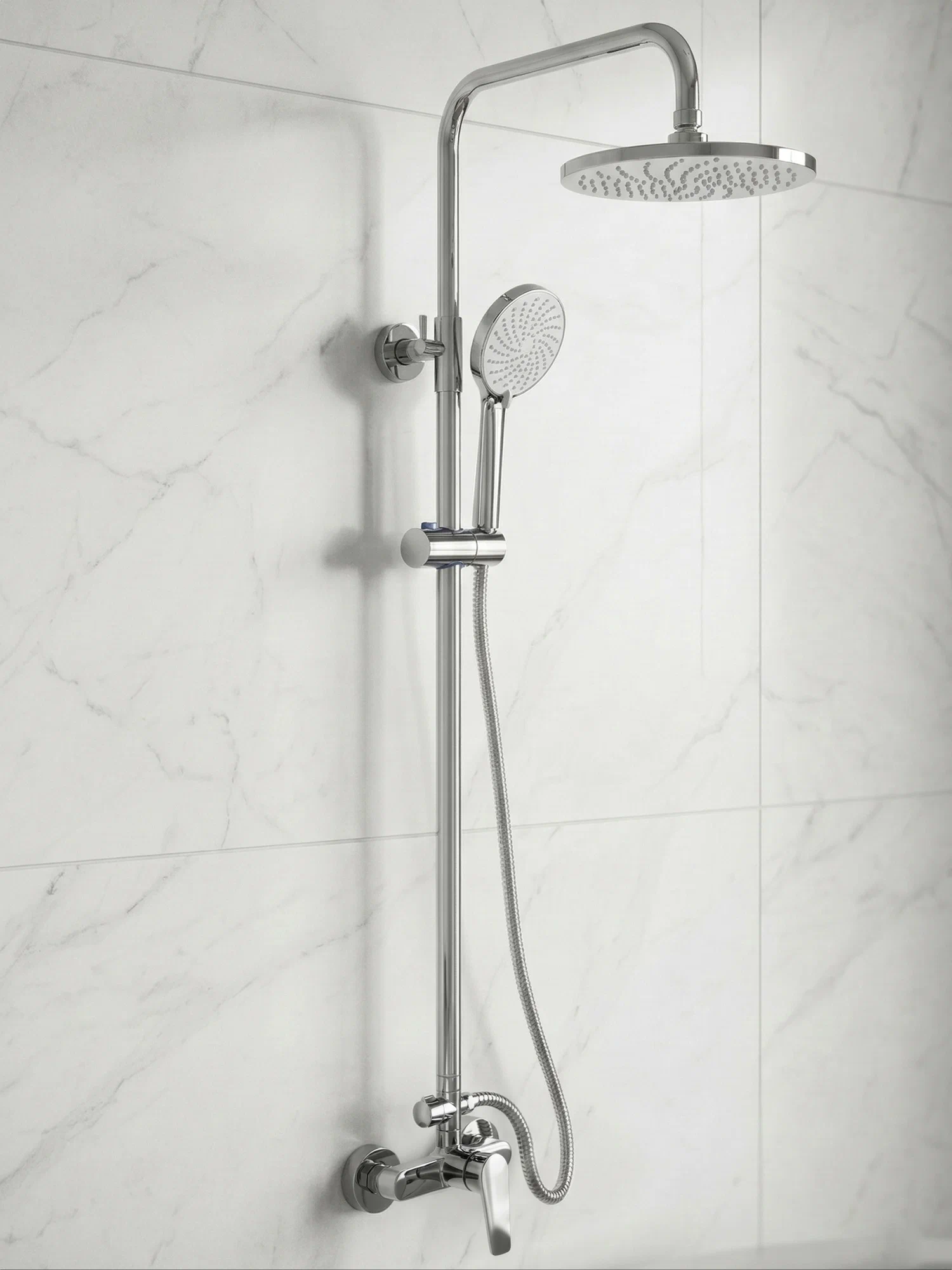 Душевая стойка со смесителем без нижнего излива. Верхний душ — режим «тропический дождь», ручная лейка с тремя режимами (классика, СПА, массаж). Корпус латунный, покрытие хром. Керамический картридж, управление рычажное. В комплекте: смеситель, стойка 1464 мм, верхний душ, лейка, шланг 1.5 м, крепления, эксцентрики. Гарантия на корпус 7 лет.