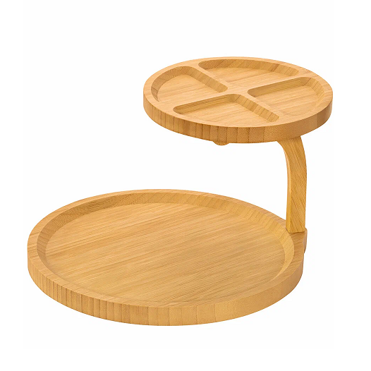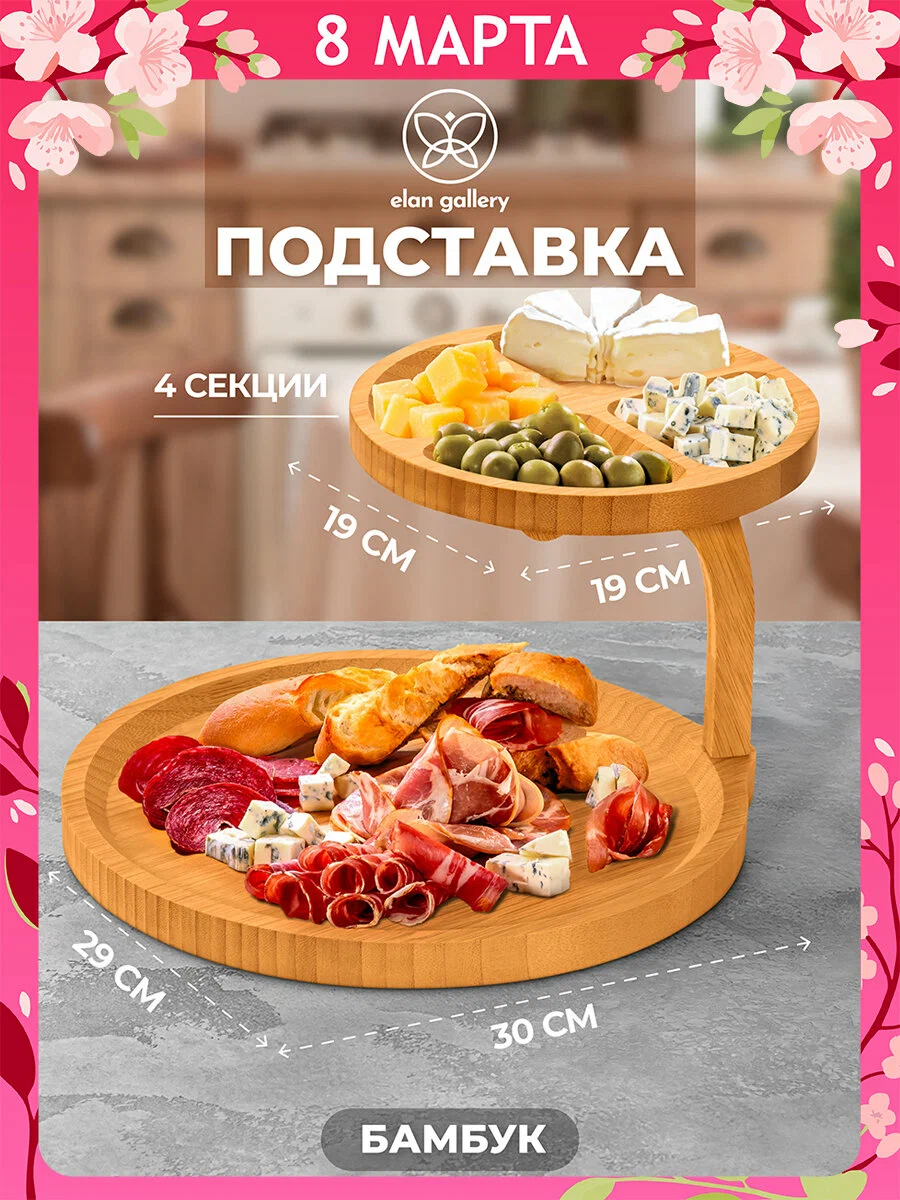 Цена самая низкая. Настольная этажерка для подачи закусок, сладостей или фруктов. Сделана из натурального бамбука, крепления металлические. Нижний ярус 30×29 см с бортиками подходит для тарталеток, нарезок или выпечки. Верхний ярус разделён на 4 секции по 7×7 см - удобно для конфет, орехов или оливок. Общий размер 30,5×29×18,5 см, расстояние между ярусами 15 см. В посудомойке мыть нельзя, абразивами не тереть, после мытья вытирать насухо. Хороший вариант для сервировки или подарка.
