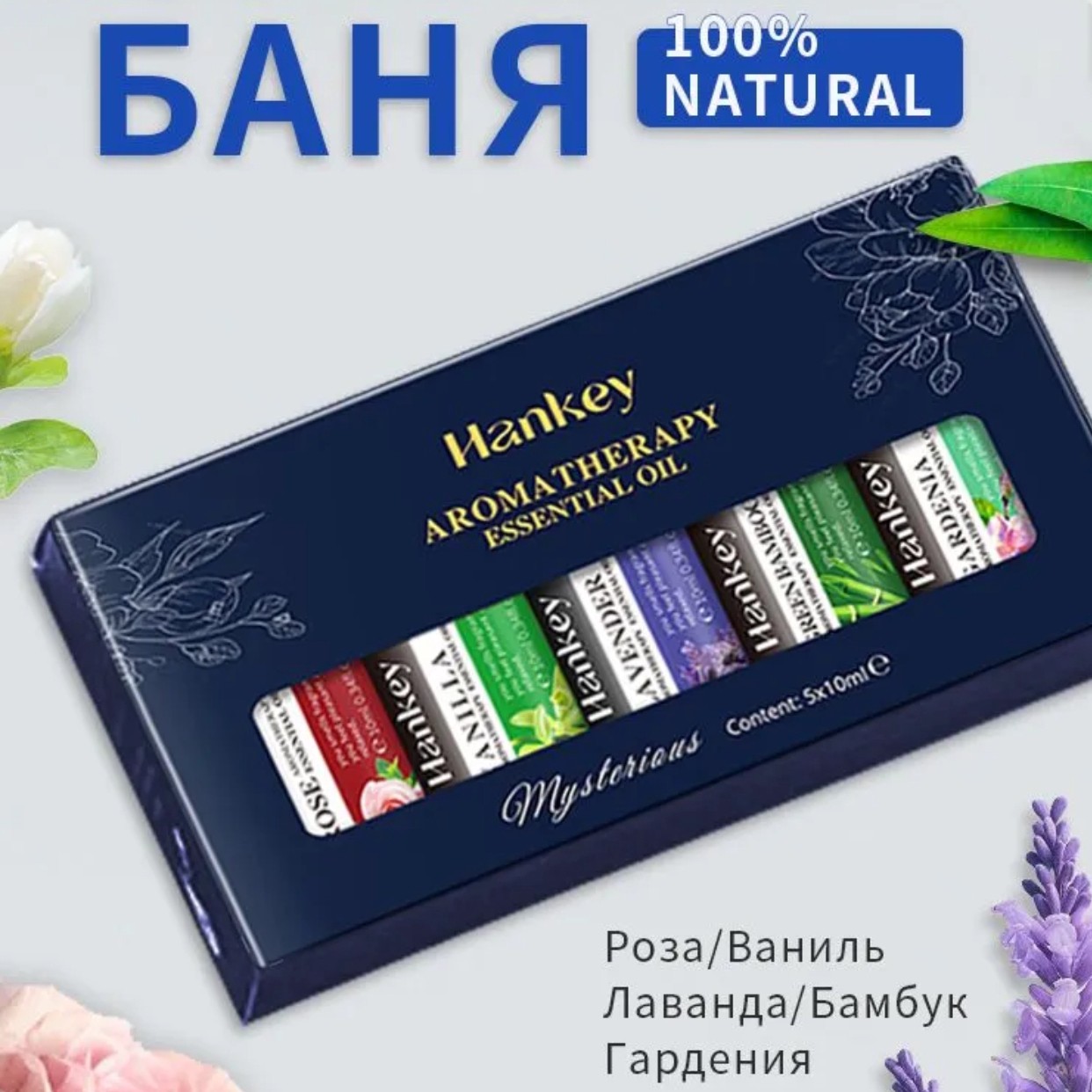 В наборе: эфирное масло розы, масло лаванды, масло ванили, масло бамбука, масло гардении.