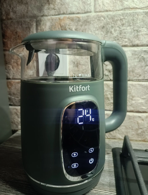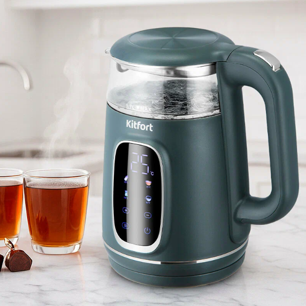с точной настройкой температуры, дисплей, с сенсорным управлением. Можно выставить температуру от 40 до 100 гр. с шагом 5 °С, Умеет поддерживать заданную температуру. Объём 1.7 литра, есть фильтр от накипи, защита от включения без воды и от перегрева.