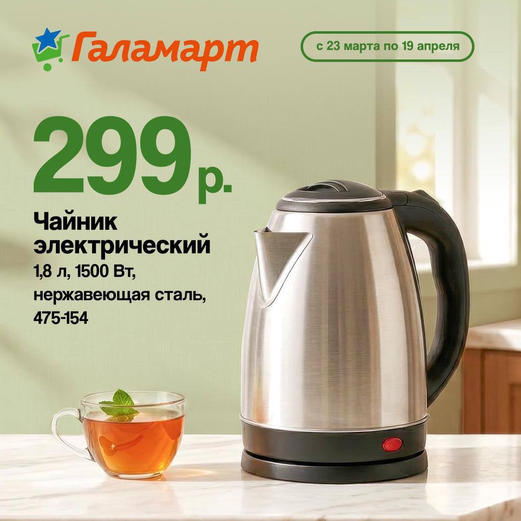 Простенький чайник объёмом 1.8 литра и мощность 1800 Вт из нержавеющей стали. Акция только в розничных магазинах