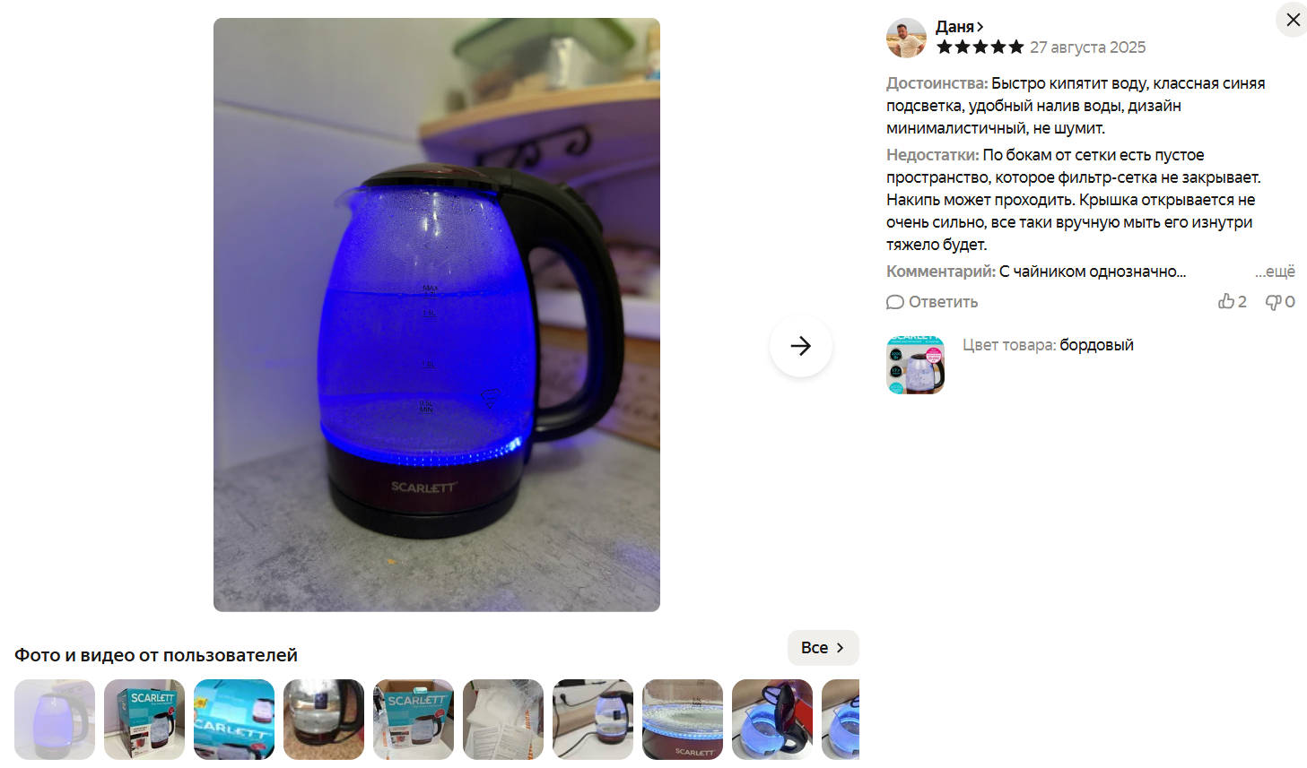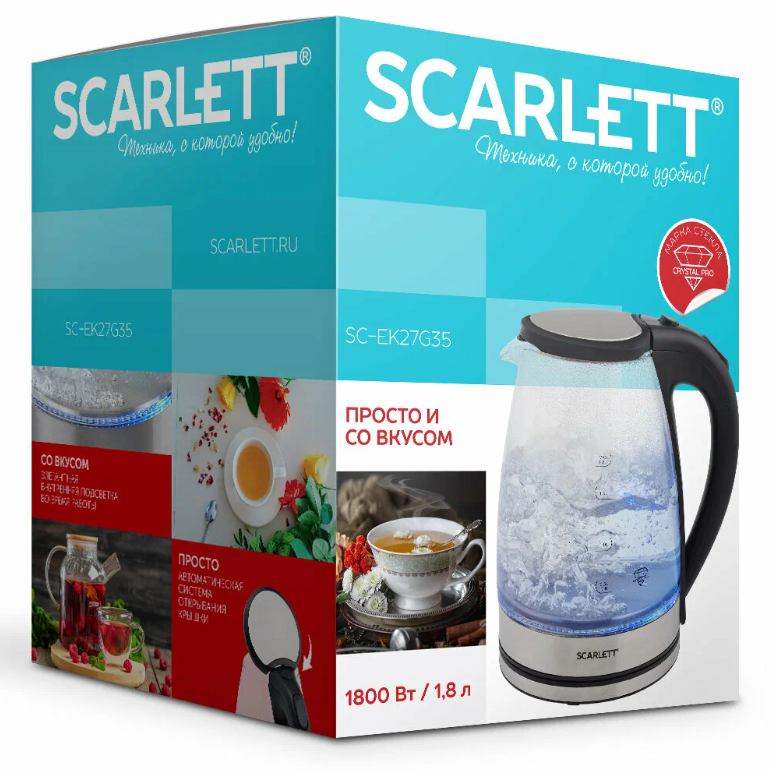 Объём 1.8 литра с корпусом из прочного стекла Crystal Pro, оборудован внутренней подсветкой и индикатором уровня воды, а также функцией автоматического открытия крышки. Безопасность обеспечивает система Safe Work, включающая автовыключение после закипания и блокировку включения без воды. Шнур питания убирается в специальный отсек на корпусе. С прокодом хорошая цена, наверное самая низкая.