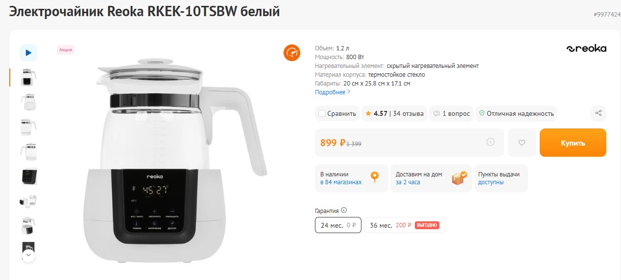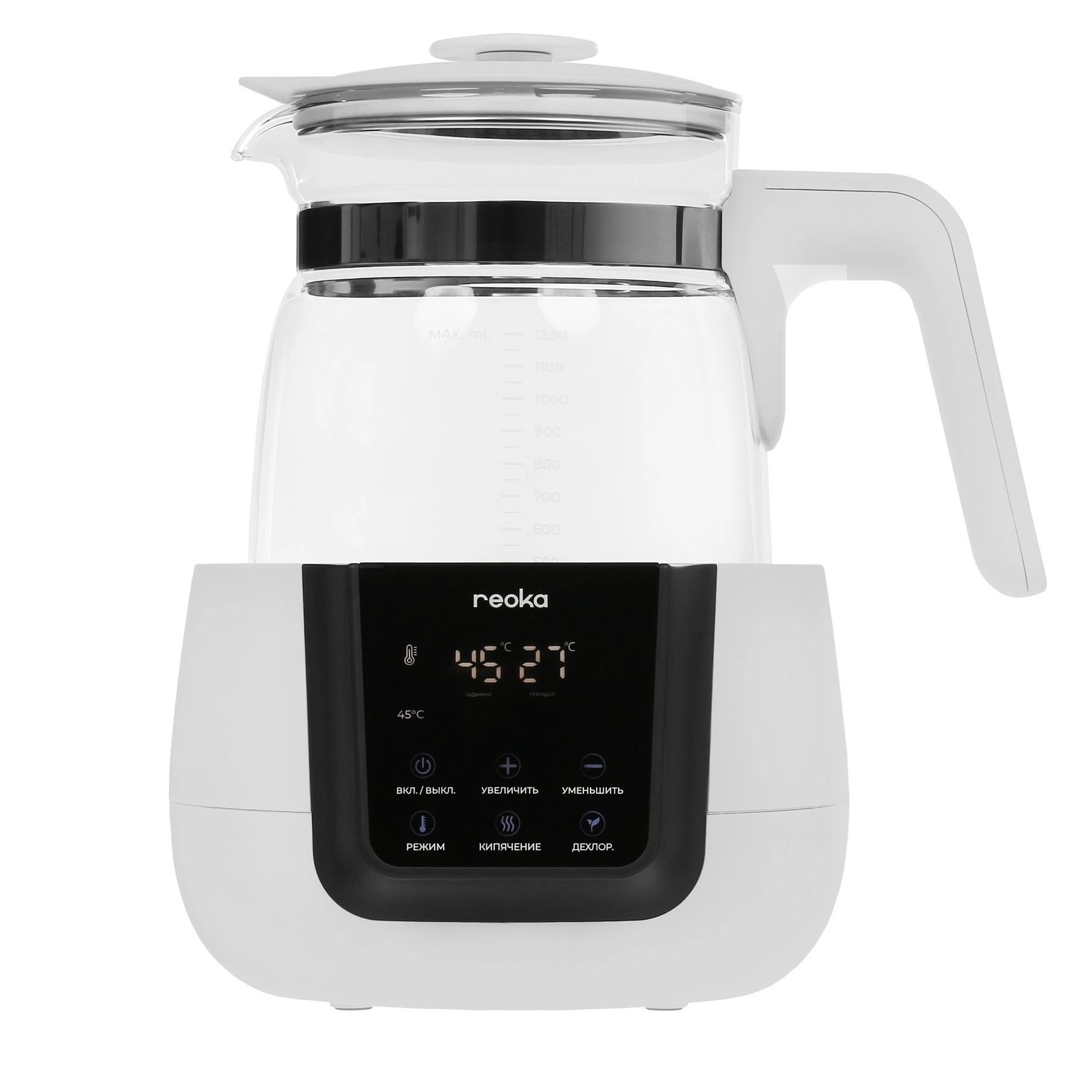 Он с колбой из термостойкого стекла, ёмкость 1.2 л, съёмная крышка. Сенсорная панель управления, регулировка нагрева 35-100°C и поддержка. Ещё какая то фишка - дехлорирование воды.