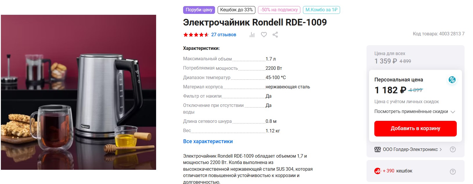 Нашла чайник, который реально удобный, если вы не пьёте один сорт чая. Rondell RDE-1009 в М.Видео - 1195₽ получается с бонусами, без них 1359 рублей. Обычно такие дороже.