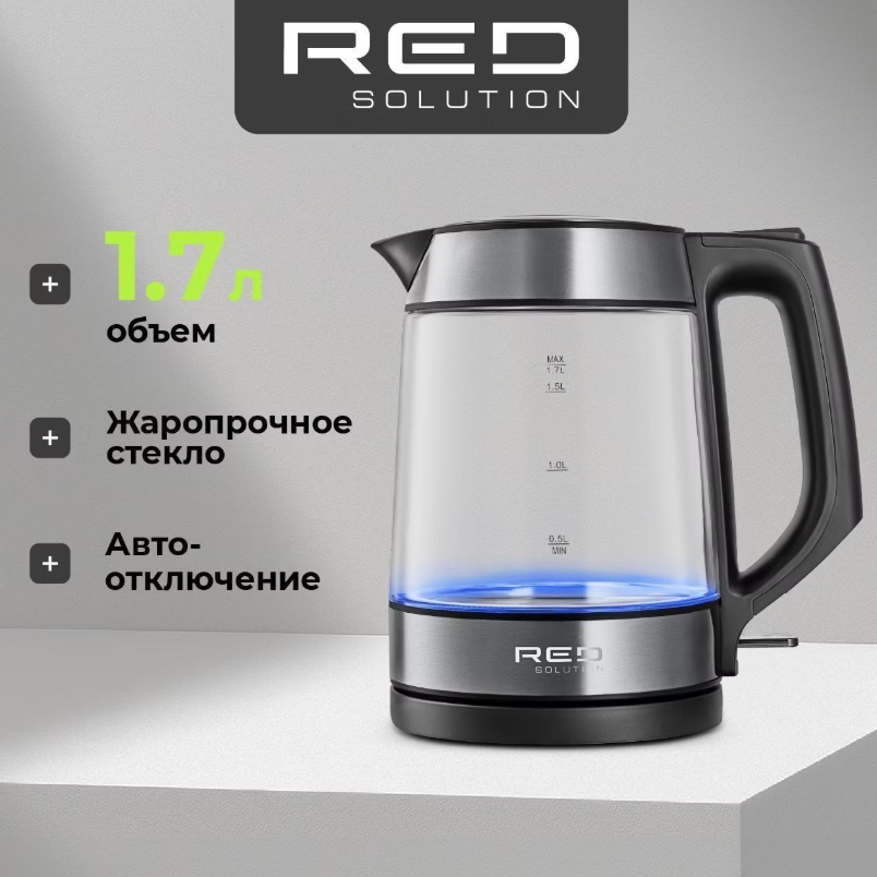 Стеклянный чайник с синей подсветкой. Красиво кипит, видно всё. Мощность 2200 Вт, 1.7 л. Нагревательный элемент скрытый.