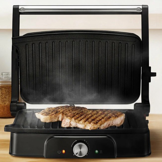 Получается, очень компактная и мощная (1500 Вт) штука с тремя режимами: можно жарить с двух сторон сразу или только с одной. Ребристые антипригарные панели дают красивые полоски, как от углей, а жир стекает в съёмный поддон - без лишней грязи. Ножки складываются, есть защита от перегрева.