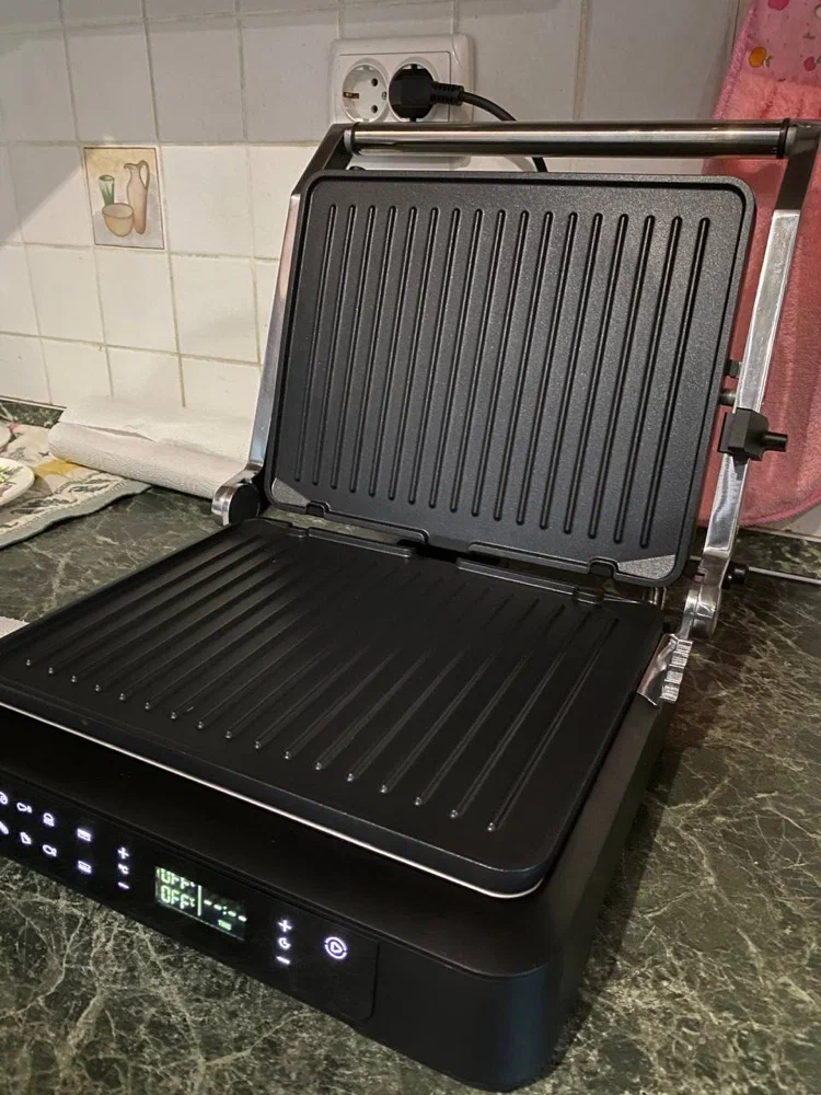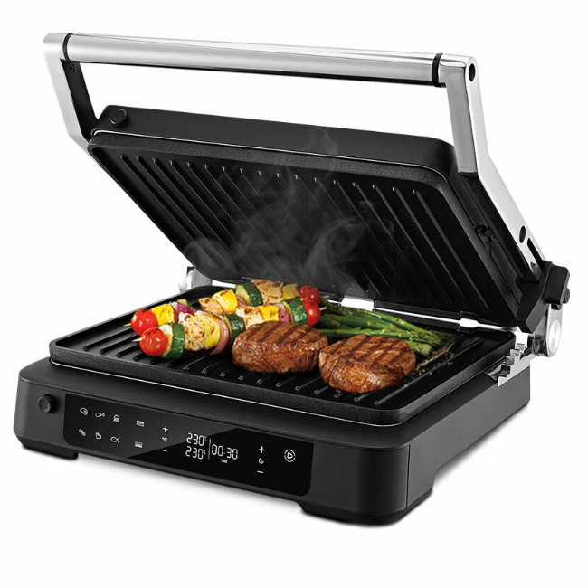 Интеллектуальная модель с сенсорным управлением и дисплеем . Можно отдельно выставить температуру для верхней и нижней панели, задать время на таймере и выбрать один из 6 автоматических режимов .Есть поддон для сбора жира . Мощность 2000 вт