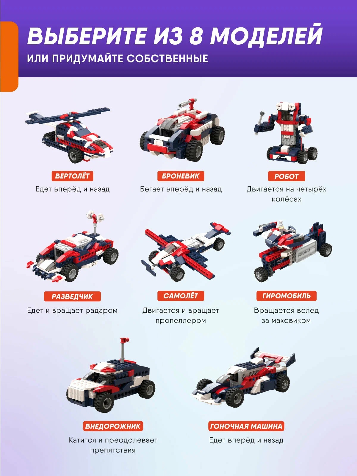 Позволяет собрать 8 разных функциональных моделей, каждая из которых что-то делает - едет, вращается, двигается, подойдет для детей от 6 лет, детали качественные, совместимы с другими конструкторами.