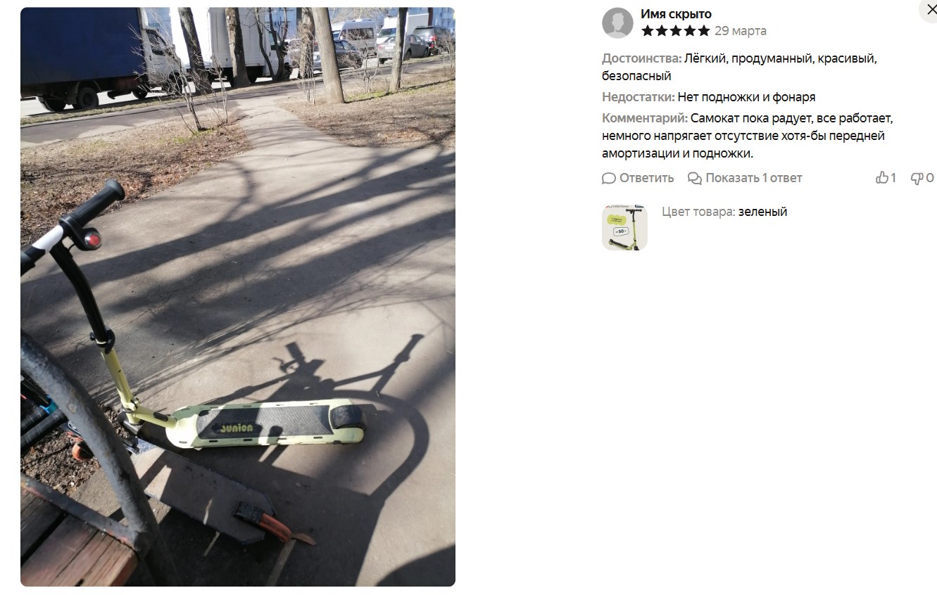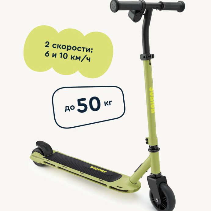 Руль регулируется по росту от 110 см, так что и подростку подойдёт. Две скорости: 6 и 10 км/ч - для спокойных прогулок или покатать ребёнка. Ножной тормоз, дека широкая нескользящая - стоять устойчиво. Заряда хватает на 10 км, заряжается 3-4 часа. Выдерживает до 50 кг. В комплекте светящаяся дека и светоотражающие стикеры - в сумерках заметно.