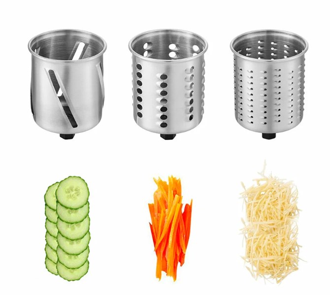 Мощность 350 Вт, скорость вращения до 1400 оборотов - морковку, сыр, орехи, шоколад перетрёт за секунды. В комплекте две тёрки (крупная и мелкая), ножевой блок с тремя ножами для измельчения и толкатель. Корпус из нержавейки, ножки прорезиненные, чтобы не прыгала, и отсек для шнура - удобно хранить.